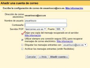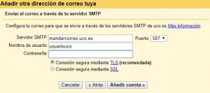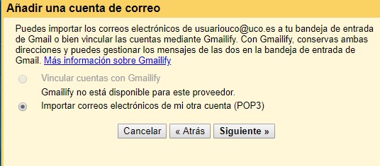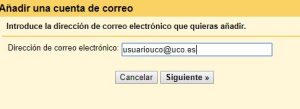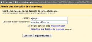 Y ya estaría! A partir de ahora, podrás enviar mensajes con tu correo de la UCO desde Gmail. Ahora falta la otra mitad: recibir mensajes. Para ello, bajamos hasta Consultar correo de otras cuentas, en el mismo apartado: